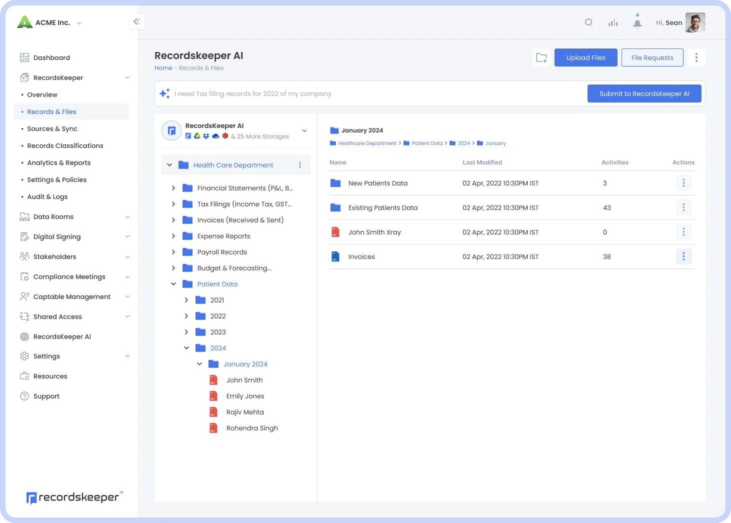 RecordsKeeper.AI is an AI-first enterprise document management platform that transforms scattered data into a Unified Intelligent System, powered by an AI agent & Enterprise Search built on top of enterprise data.